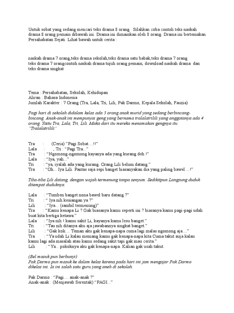 Naskah drama 8 orang tentang pendidikan. 08112019 Admin dari Berbagai Teks Penting 2019 juga mengumpulkan gambar-gambar lainnya terkait teks drama 8 orang tentang persahabatan dibawah ini. 10 Contoh Kalimat Repetisi dalam Bahasa Indonesia 12 Contoh Majas Paradoks dalam Kalimat Bahasa Indonesia.